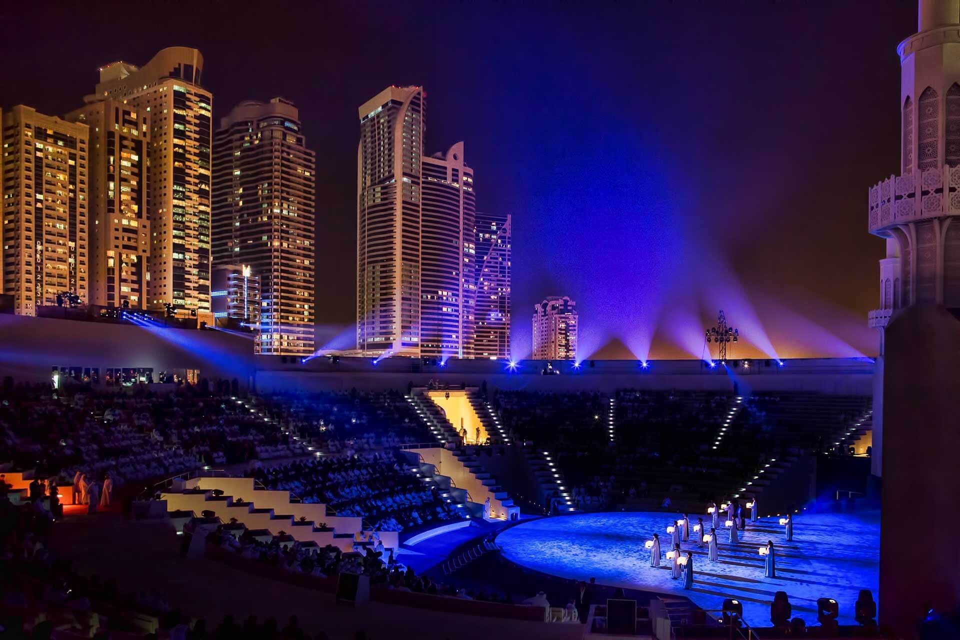 يعد هذا الصرح الثقافي أحد الإنجازات المعمارية الأولى من نوعها في المنطقة، وأحد أكثر المشاريع طموحاً وأهمية في الشارقة. وقد شيّد المسرح على طريقة المدرج الروماني، فهو مسرح نصف دائري مفتوح في الهواء الطلق، ومقام على مساحة سبعة آلاف و238 متراً مربعاً، ويضم مدرجات مقسمة على مجموعات تتسع لـ 4500 متفرج، وتتوسط المسرح منصة عرض كبيرة يعتليها الفنانون لأداء عروضهم. وزود المسرح بنظام صوتي متطور عالي الجودة والدقة.