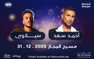 استقبلوا العام الجديد مع أحمد سعد وسيلاوي حيث الطاقة الموسيقية المبدعة تملأ الأمسية! ليلة استثنائية تجمع صوتين يملآن المكان دفئاً وطرباً. أحمد سعد وسيلاوي يلتقيان على مسرح المجاز، حيث تتلاقى الأضواء مع الألحان في مشهد لا يُفوَّت. عيشوا لحظات تُحفر...